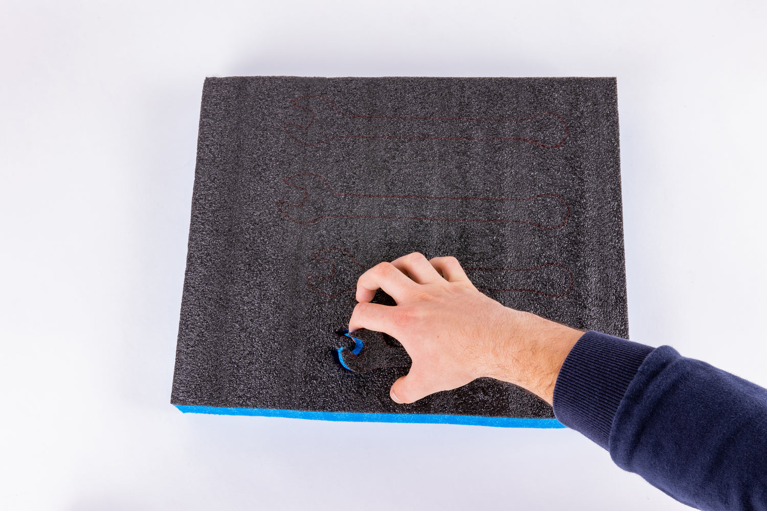 Set your cutter knife to the desired height and cut out the foam according to your markings. Then reach under the deepest cut layer with your finger and separate the top layers from the bottom ones.